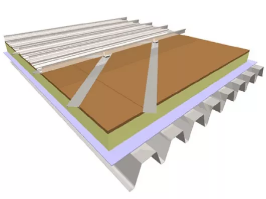 • Поступающая влага, будь то просачивающаяся по причине обильных осадков вода, конденсат, возникающий при резком падении температуры на нижней части настила, или же просочившаяся сквозь пароизоляцию и изоляционный слой влага, из внутреннего пространства конструкции может быть отведена за счет конвективного движения воздуха в нижнем зазоре,